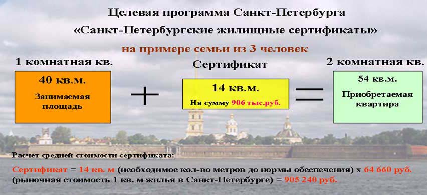 Эта программа рассчитана на граждан, которые проживают в отдельных квартирах и состоят на учете по улучшению жилищных условий, то есть являются городскими очередниками. На сегодняшний день в Петербурге учетная норма равна 9 кв. м общей площади на одного человека, если приходится меньше, граждане имеют право на постановку на учет. Норматив обеспечения жильем составляет 18 кв. м на человека. Приведу конкретный пример улучшения жилищных условий с использованием средств жилищного сертификата для семьи из трех человек. Если эта семья занимает однокомнатную квартиру в 40 кв. м, то для обеспечения жилой площадью ей необходимо еще 14 кв. м.