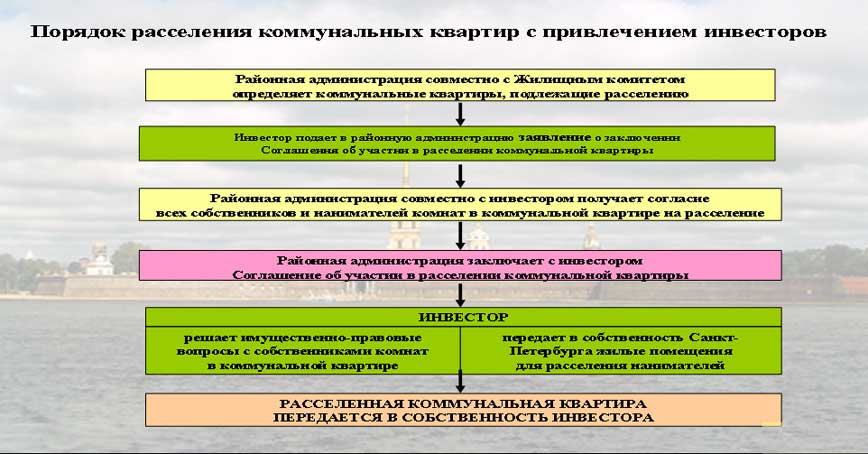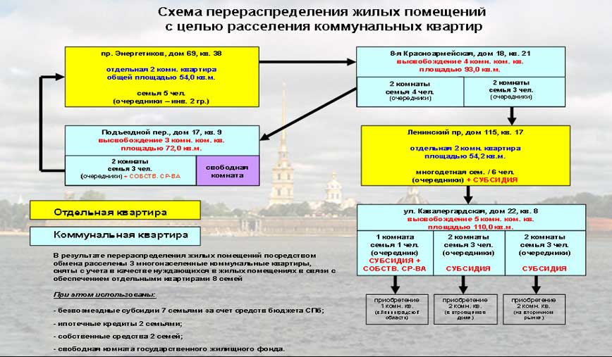 Вначале создается так называемый адресный перечень квартир, которые подлежат расселению. Затем заключается трехстроннее соглашение (Жилищный комитет, районная администрация, инвестор). И в результате использования механизма мены, отчуждения в пользу третьего лица, а также резервов госжилфонда расселяется коммунальная квартира и передается в собственность инвестора как единый объект. Если суммировать все эти механизмы, мы полагаем, что к 2011 году порядка 56,5 тыс. семей будут расселены, из них 40,5 тыс. — городские очередники, которые будут сняты с учета.