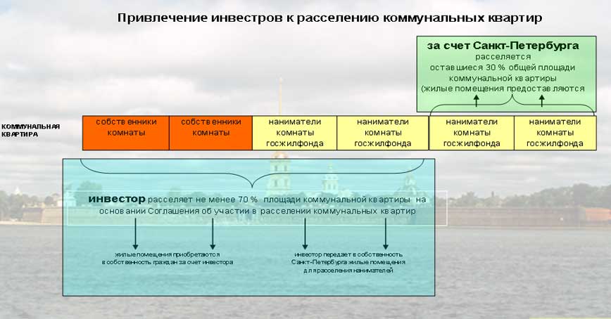 Мы предлагаем бюджетные субсидии каждой семье, проживающей в коммунальной квартире, но при одном условии. Внутри себя, по заявочному принципу, семьи должны договориться, что они будут продавать квартиру как единый объект одному инвестору-покупателю. При этом город готов предоставить субсидию размером до 30% от норм обеспечения жильем. И мы полагаем, что эта дельта позволит сделать процесс расселения коммунальных квартир инвестиционно привлекательным.